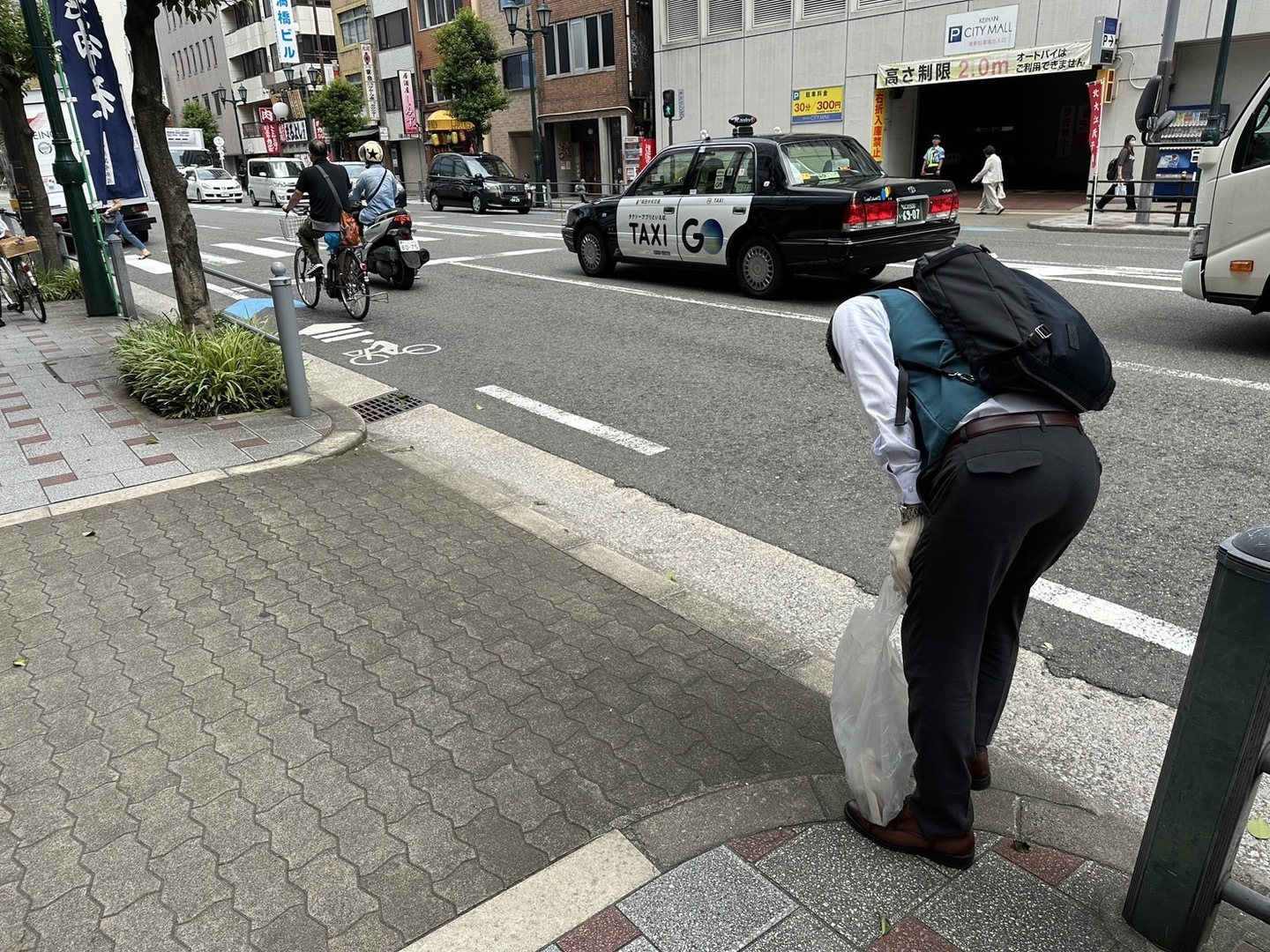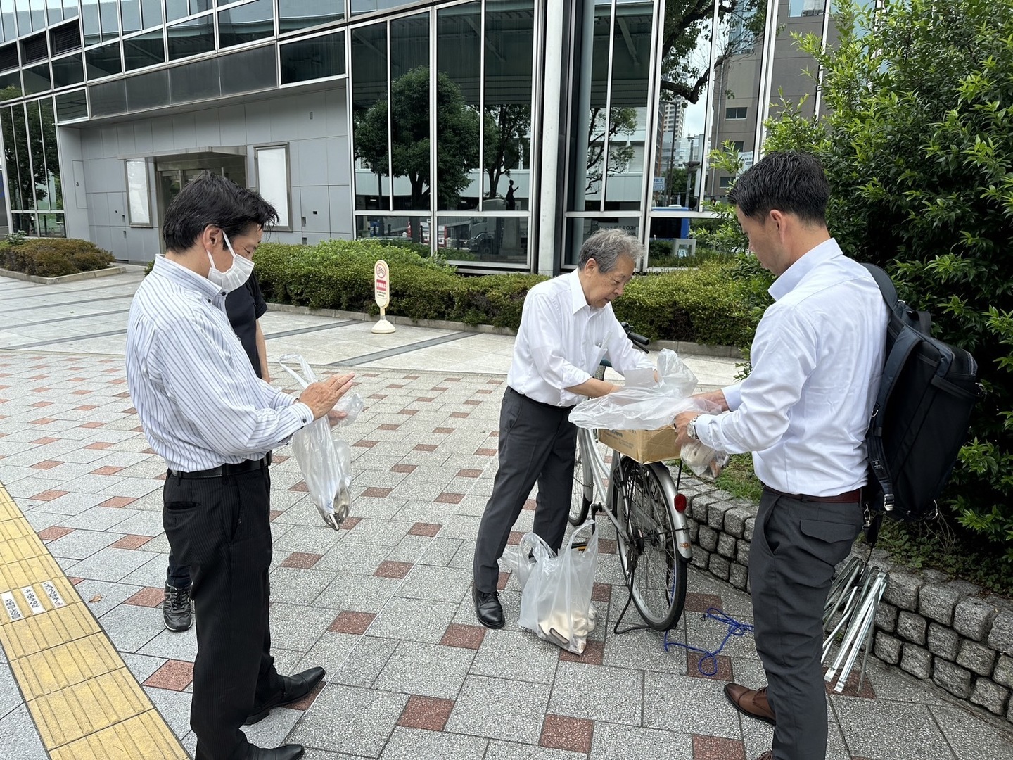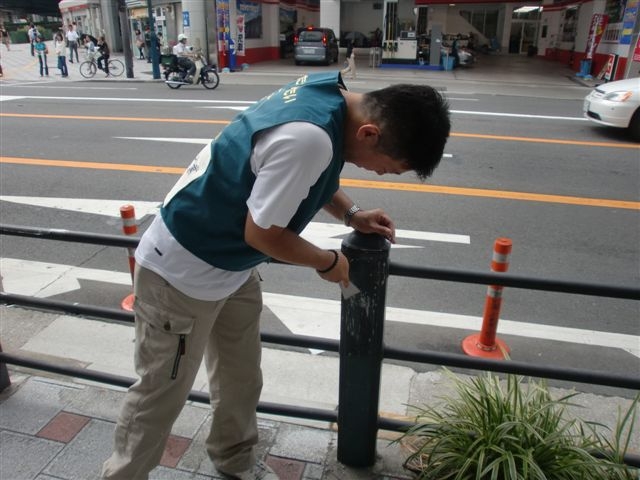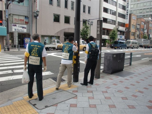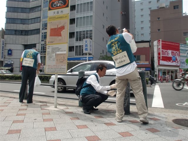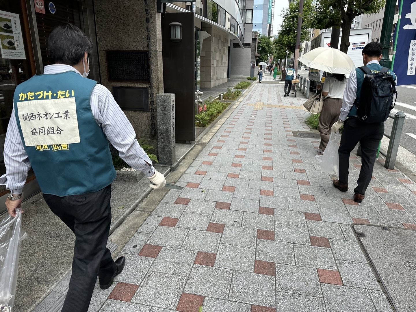 組合活動の一環として私たちが取り組んでいる事業の一つに「かたづけたい」があります。路上違反簡易広告物撤去活動員制度というもので、主に京阪天満橋付近で、道路上のはり紙・はり札・立て看板などの違反簡易広告物を撤去する活動を、関西ネオン工業協同組合として組合をあげて事業活動として社会に貢献しております。